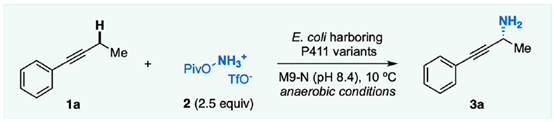 该研究利用P450酶作为催化剂,实现了以羟胺化物PivONH3作为氮烯前体对炔烃进行对映选择性炔丙基胺化。