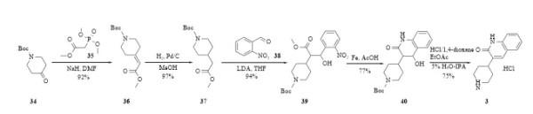 路线二[12]:以2-氯喹林为原料,经3步反应(与哌啶酮反应、取代、脱苄基)得到中间体3(图11)。图11. 中间体3的合成路线二路线三[13]:以哌啶4乙酸衍生物(44或45)和苯胺(46)为起始原料,经3步反应(缩合、环化、水解)得到中间体3(图12)。
