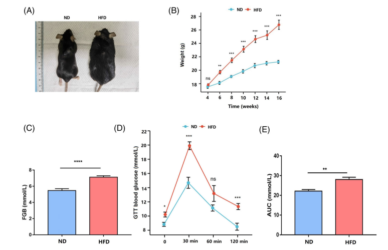 高脂肪饮食(HFD)组的FGB值始终高于正常饮食(ND)组,此外,OGTT结果表明,高脂肪饮食(HFD)组小鼠是葡萄糖不耐受的。